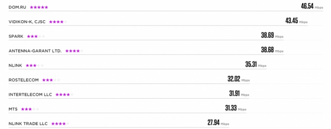 Далее расположились Ростелеком — 32,02 Мбит/с, WestCall — 31,91 Мбит/с, и вновь возвратившейся СОТКОМ со скоростью 23,49 Мбит/с.